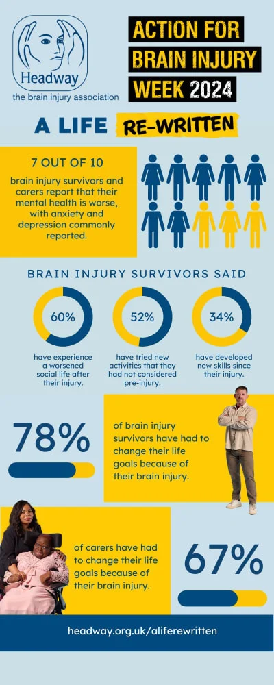 Research by national charity, Headway – the brain injury association reveals that more than three quarters of people with brain injuries (78% of survey respondents) have had to change their life goals as a result of the consequences of their brain injuries. Examples of the types of goals that have had to change include: