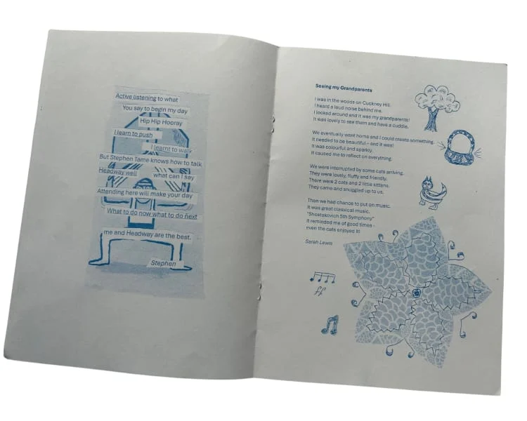 The Creative Writing group, comprising individuals supported by Headway Nottingham, meets every Tuesday to explore self-expression through poetry, storytelling, and free writing, and since March, has focused on creating their beautiful anthology, which was showcased on the stage at Nottingham’s City Arts venue.