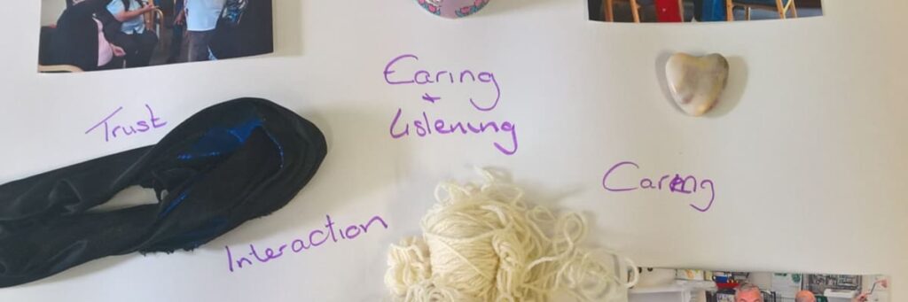 Some improvised discussion around an object in the room – a walking stick, led to talk about Ian Dury and the Blockheads’ song “Hit me with your Rhythm Stick”, which caused a lot of laughter and nostalgia amongst the group as most of us knew and enjoyed the song. Over the next few sessions, music was a key feature in our creative work. Group members named and shared songs that had an importance for them and shared these important memories with the group, from which we constructed our own Dream Playlist. The group showed themselves to have varied and interesting passions in music, from Punk, to Country and Western, to Funk and Soul, and Classical.